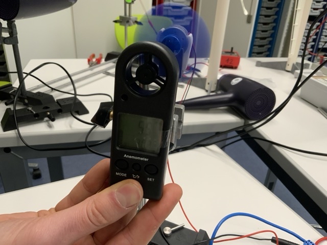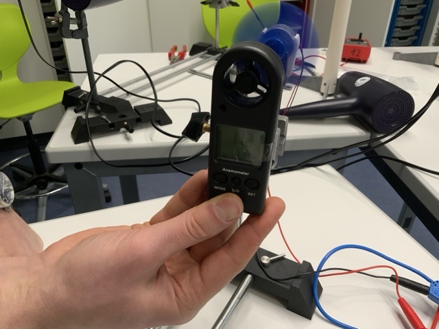 Hier wird die Windgeschwindigkeit verändert, indem der Fön von schwacher auf starke Stärke gestellt wird, dann die Windgeschwindigkeit und die Leistung gemessen. Es zeigt sich, wenn die Windgeschwindigkeit um einen Faktor < 2 steigt, kann die Leistung um > 5 steigen.