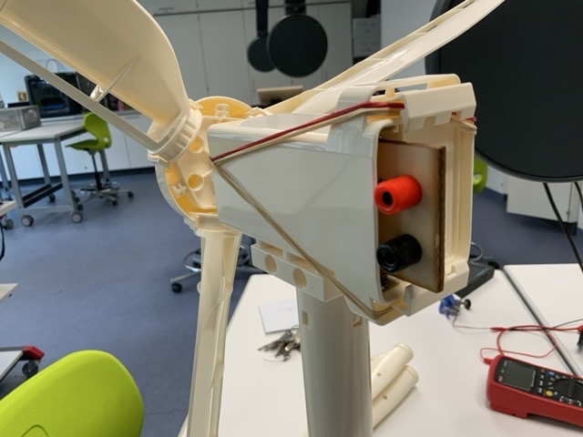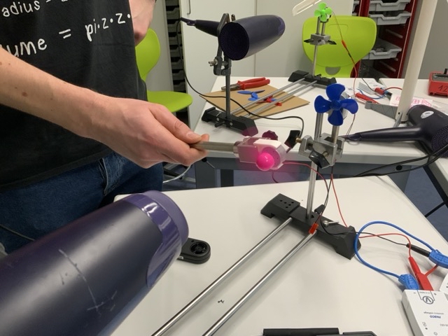 Windräder austauschen, um festzustellen, dass die Leistung massiv vom Rotor und besonders von der Rauhigkeit abhängt. Tipp: mit einer Pappe den Luftstrom unterbrechen, um den Rotor zum Stillstand zu bringen ohne den Fön zu berühren und dabei zu dejustieren.