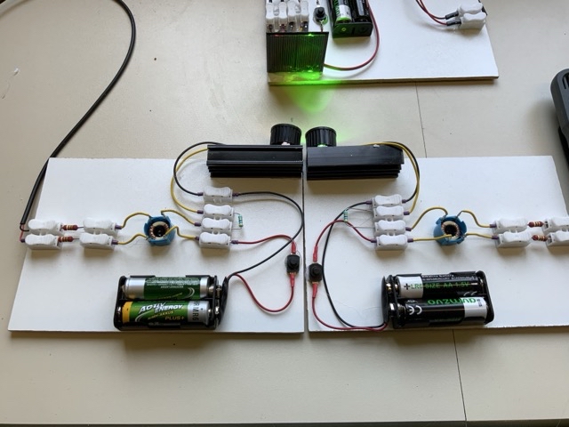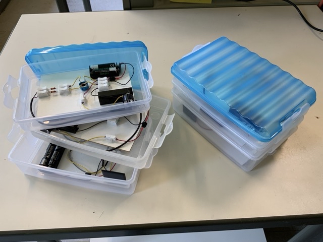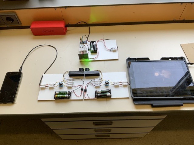 Ablauf: Batterien einlegen, IPads anstecken und Ton abspielen lassen (z.B. Text und Musik oder 2 Musikstile), Lautsprecher am Empfangsmodul anschließen, LEDs auf Solarzelle ausrichten und Schalter drücken, man hört beide Töne gleichzeitig.